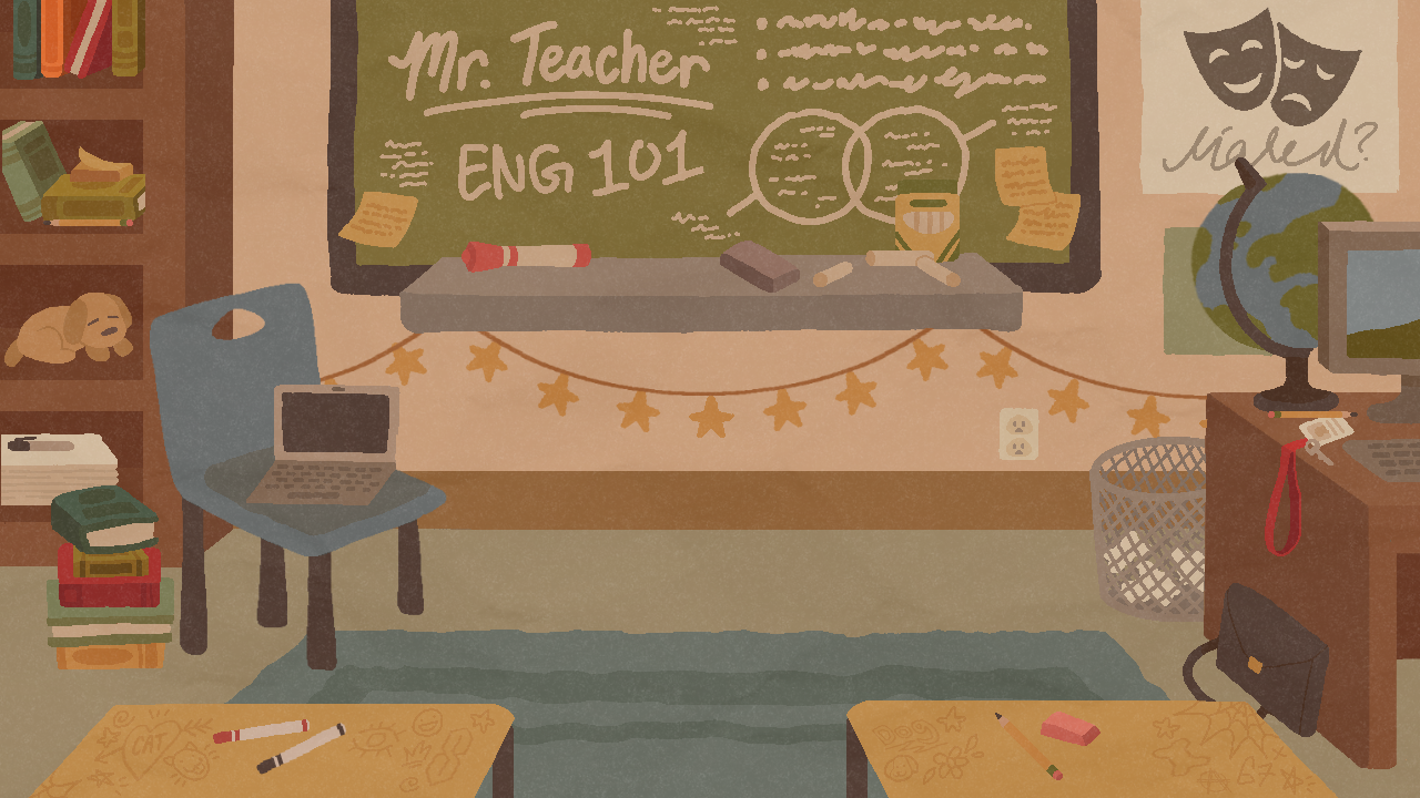 The game has some audio issues, so we highly encourage users to wear headphones and fiddle with volume. This game also has content warnings included. It deals with heavy stuff (white supremacy, transphobia, and suicide). There's no VO for the student. If the game gets a good response, we may add VO for that character.